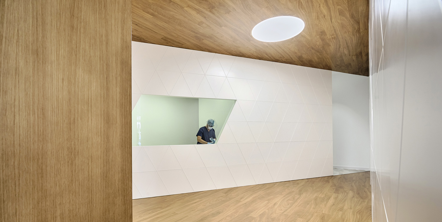 La confianza y la profesionalidad se refuerzan con la utilización de maderas que convierten un espacio (y un sector), en principio frío, en un cálido remanso de paz.