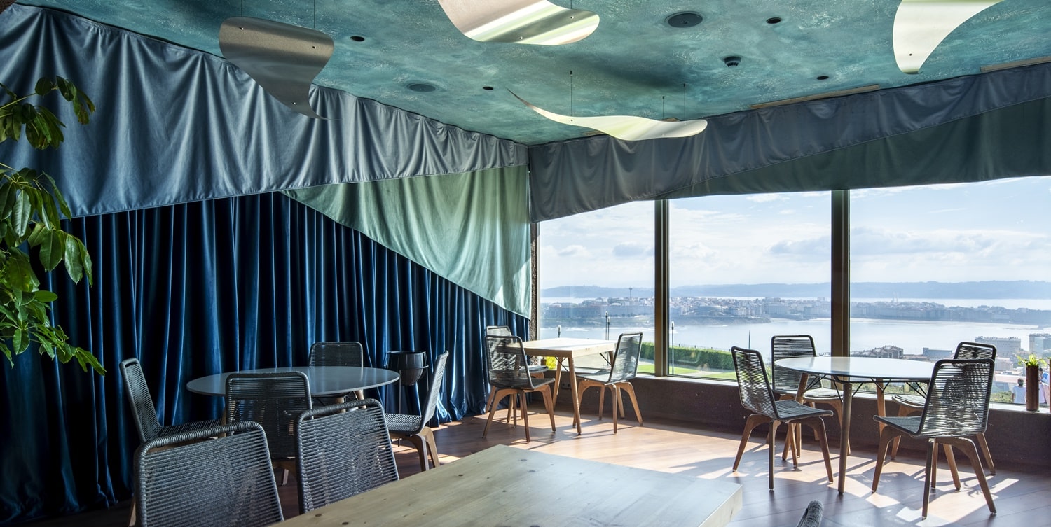 Con una intervención contenida, concebimos un espacio desenfadado e inspirado en el fondo marino, del que procede gran parte de la propuesta gastronómica, y del que es imposible apartar la mirada, dadas las excelentes vistas a la bahía de Riazor que nos regala la excelente ubicación del espacio.