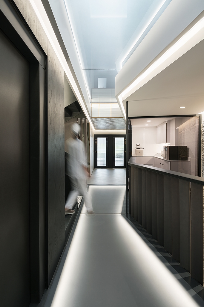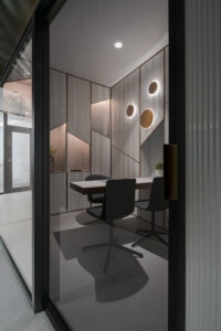 Los gabinetes se encuentran ubicados en los extremos de las plantas, aprovechando las vistas hacia la fachada principal y un patio privado. Esta disposición estratégica conecta a los pacientes con el exterior, integrando la naturaleza y la luz en la experiencia. En cuanto a los materiales, la madera teñida en negro aporta profundidad y carácter, mientras que los detalles en dorado y el vidrio translúcido generan un equilibrio perfecto entre sofisticación y funcionalidad. El vidrio, con acabados translúcidos y acanalados, permite el paso de la luz de forma elegante, creando un juego de sombras que enriquece el espacio.