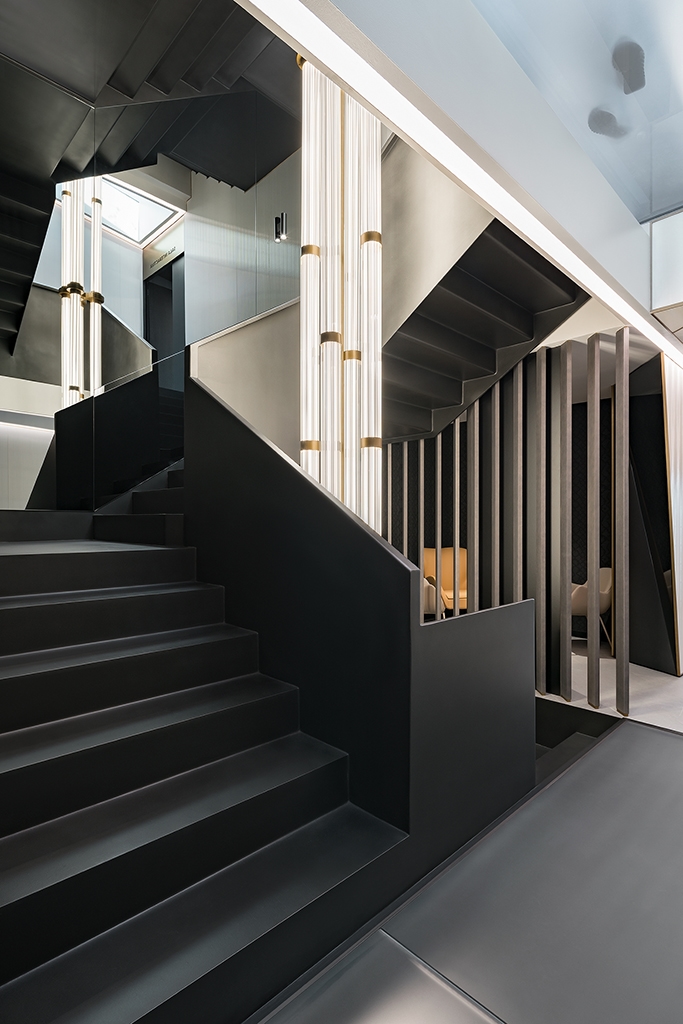 La iluminación tiene un papel protagonista en el diseño, combinando luz natural con luminarias artificiales estratégicamente seleccionadas. Los perfiles dorados en la iluminación indirecta guían al visitante y realzan las líneas arquitectónicas del espacio, aportando una sensación de calidez y elegancia. La integración de luz decorativa en elementos clave, como la escalera central y el mobiliario a medida, añade un nivel adicional de detalle y exclusividad.